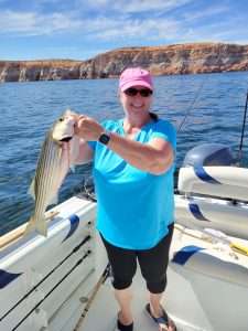 It is feast or famine but the best is “it’s still fishing” on beautiful Lake Powell. Last two weeks before the full moon, the early morning top water bite on popper, zara spoks and fly’s from 5:30 a.m. to 7’ish has been excellent with little exceptions being just not fortunate to locate the action. There in lies the key of observing the bird activity, the sun and shaded areas and then the luck factor applies too!.